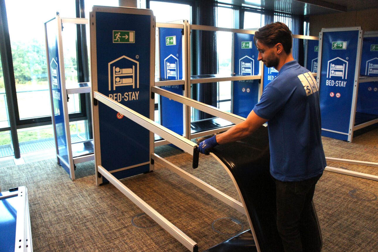 Die Liegefläche besteht aus einer gespannten und gepolsterten Plane aus schwer entflammbarem PVC. Das gesamte System ist durch Wischen vollständig desinfizierbar. Außerdem kann die Außenfläche des Bed-Stay individuell gebrandet werden.
