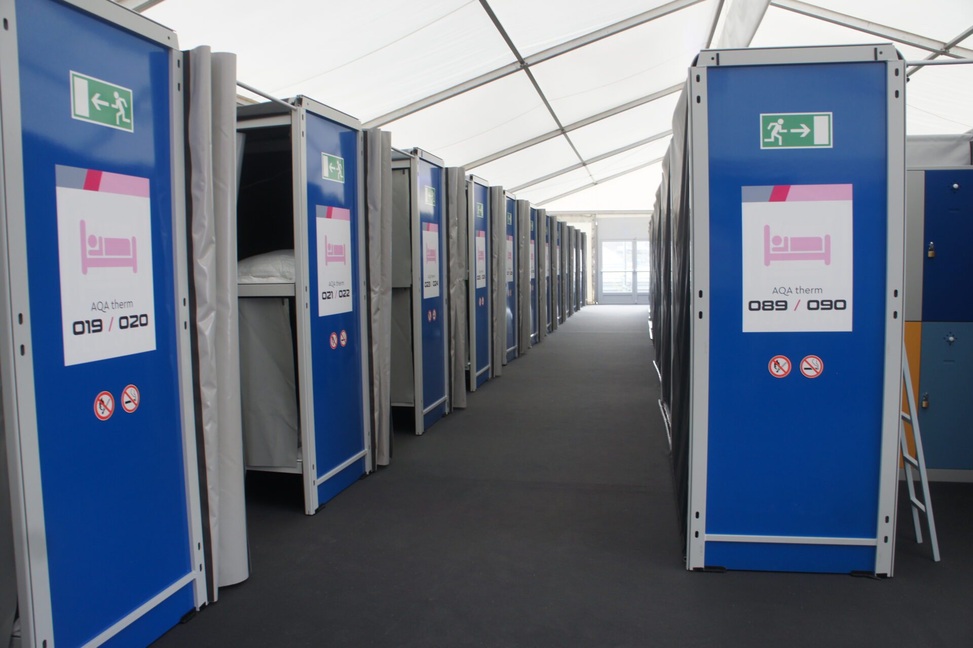 Mit diesem modularen System können Zimmer für bis zu acht Personen geschaffen werden. Der Schlafbereich kann auch mit Schließfächern, Steckdosen, Bettwäsche und anderen persönlichen Hygieneartikeln ausgestattet werden.