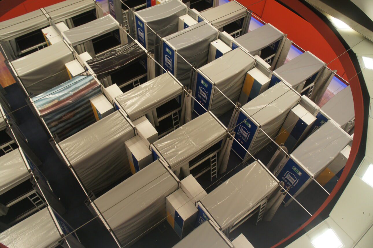 Das Bed-Stay Cube-System ist eine Zimmer-im-Zimmer-Schlaflösung. Diese temporäre Unterkunft bietet einer großen Anzahl von Personen viel Privatsphäre auf kleinem Raum.